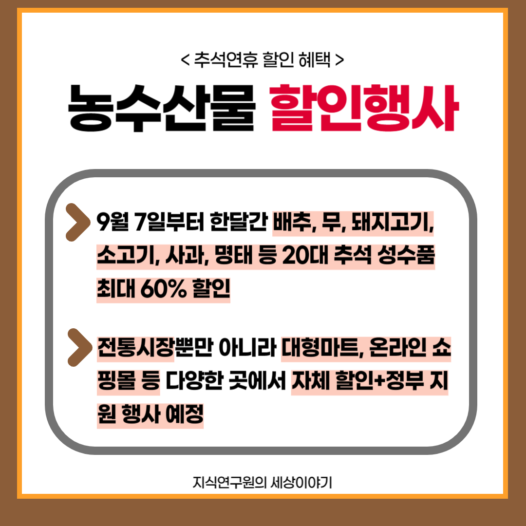 9월 7일부터 한달간 배추, 무, 돼지고기, 소고기 등 추석 성수품 최대 60% 할인됩니다.