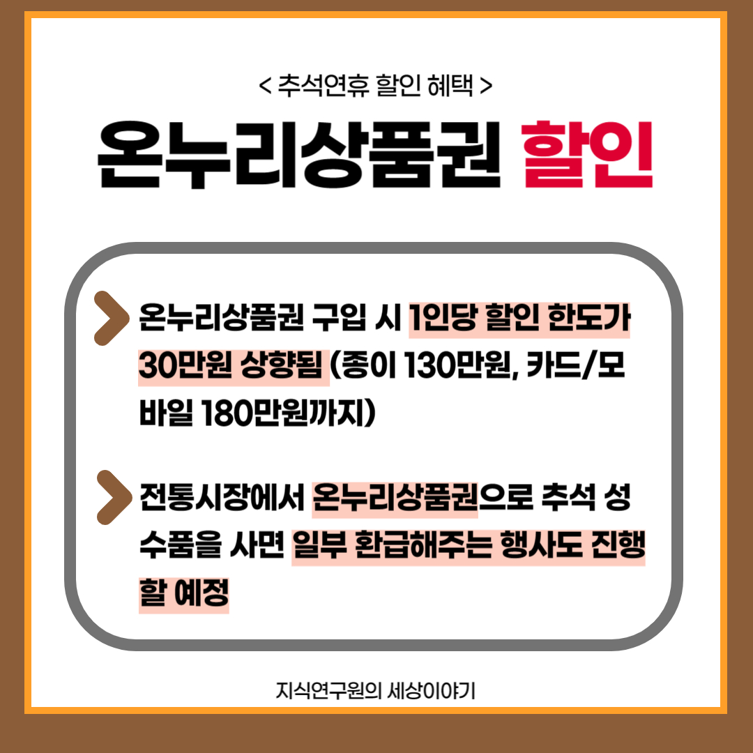 온누리상품권 구입시 1인당 할인 한도가 30만원 상향됩니다. (종이 130만원, 카드/모바일 180만원까지)