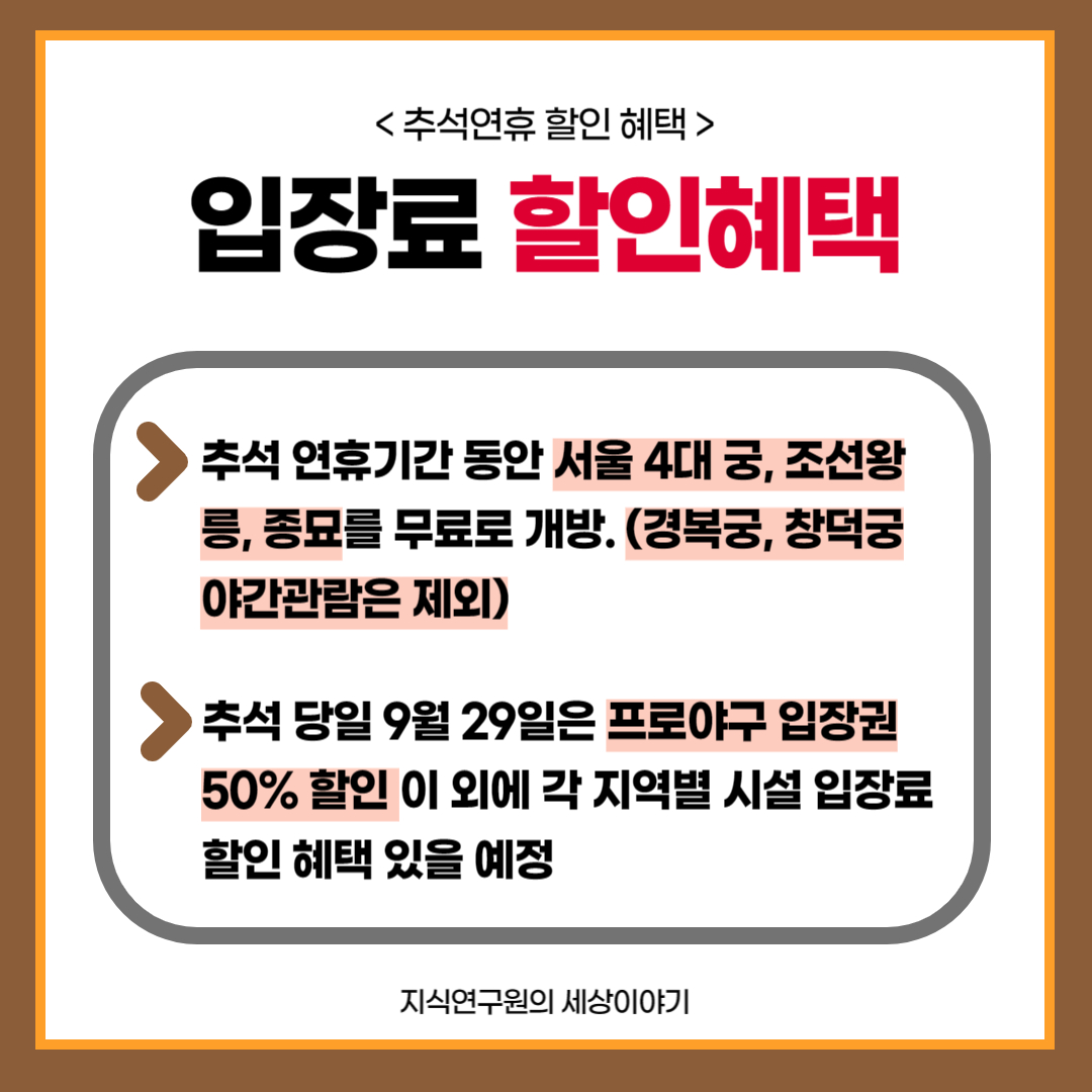 추석 당일 9월 29일 프로야구 입장권 50% 할인 혜택이 있으며, 이 외 각 지역별 시설 입장료 할인 혜택이 있으니 미리 알아보고 혜택 받으세요.