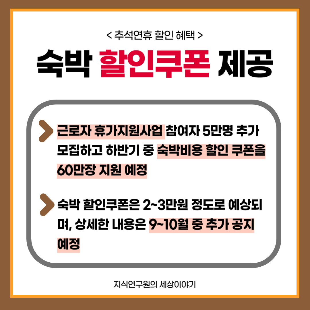 근로자 휴가지원사업 참여자 5만명 추가 모집하고, 하반기 중 숙박비용 할인 쿠폰을 60만장 지원합니다.