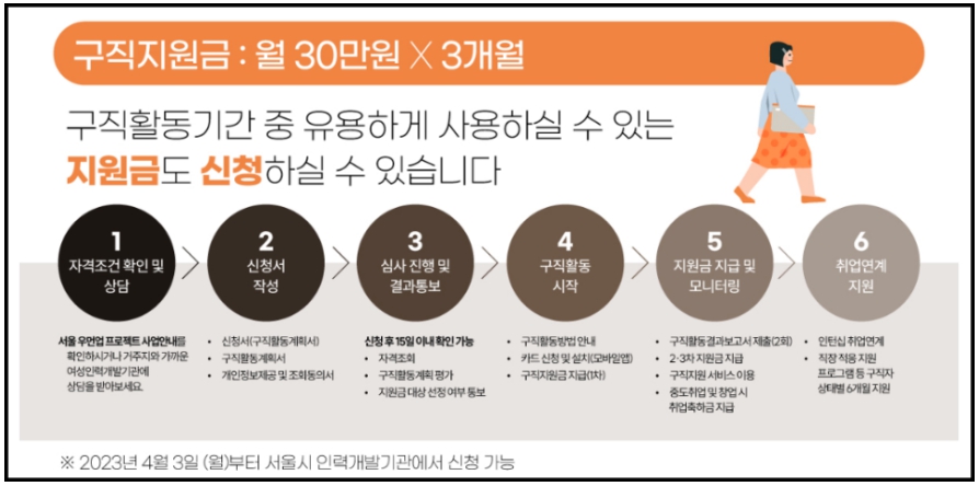 만30세~만49세의 미취업 여성들에게 30만원씩 3개월간 (1인 최대 90만원) 구직 지원금을 지원합니다.