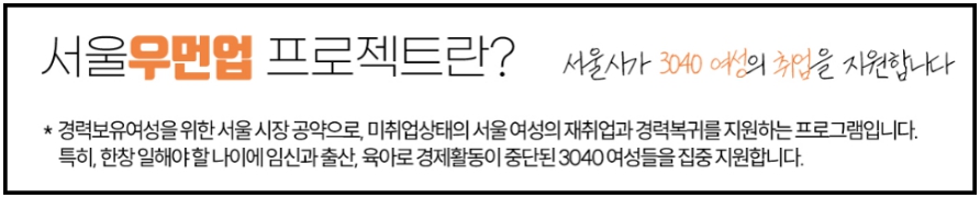 서울 우먼업이란 서울특별시에서 취.창업 의지가 있는 3040 여성들의 '경제활동 참여 촉진 및 지속가능한 일.생활 지원'을 위해 여성들의 재취업과 경력 복귀를 지원하는 프로젝트입니다.