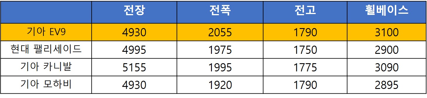 EV9이 모하비보다 약간 크며, 실제로 모하비는 프레임 바디의 내연기관 차량이기 때문에 EV9이 훨씬 크게 느껴질 것입니다. 카니발보다 전장을 제외한 모든 사이즈가 더 크기 때문에 국내 차량 중 최고일 것이라 기대됩니다. 이제부터 편안하게 차박을 즐길 수 있겠죠?