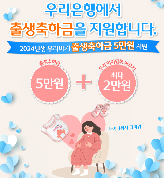 우리은행 고객의 2024년생 출생아에게는 출생축하금 5만원을 지원합니다.